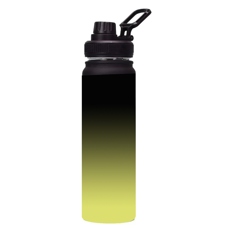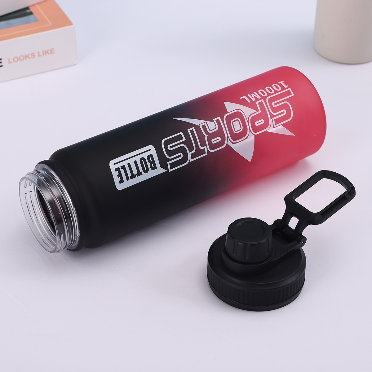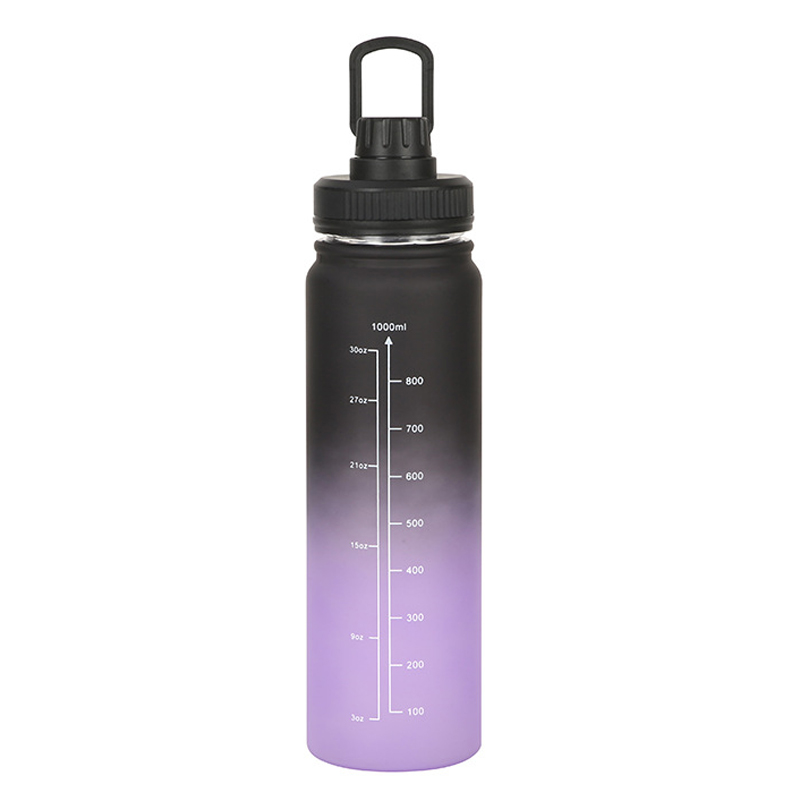 Este copo esportivo ao ar livre gradiente de 1000ml apresenta um design elegante com uma tampa equipada com alça para fácil transporte.