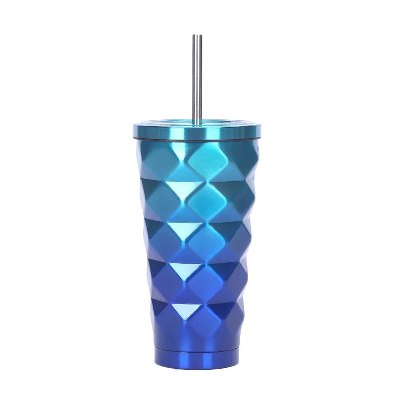 Design: O copo apresenta um padrão 3D em forma de diamante que cria uma textura semelhante a abacaxi, combinada com cores gradientes (como gradientes laranja-ouro, azul-roxo, multicolorido e rosa-ouro), tornando-o moderno e atraente ao mesmo tempo que combina apelo artístico com textura.