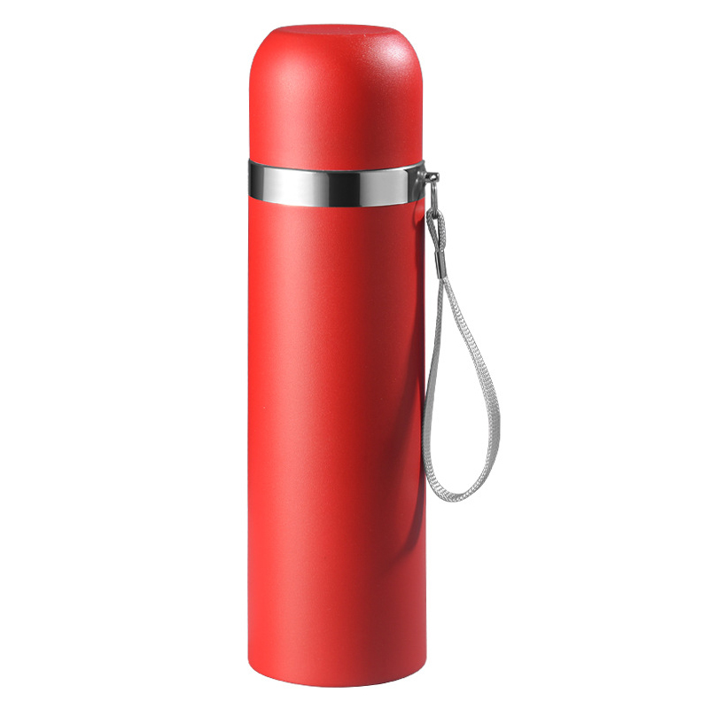 O balão térmico. Sua altura é de 24 cm e seu diâmetro é de 6,8 cm. Possui um anel de aço inoxidável ao redor do pescoço e uma alça de transporte cinza presa ao lado. O balão térmico é um produto diário comum usado para manter líquidos quentes ou frios.