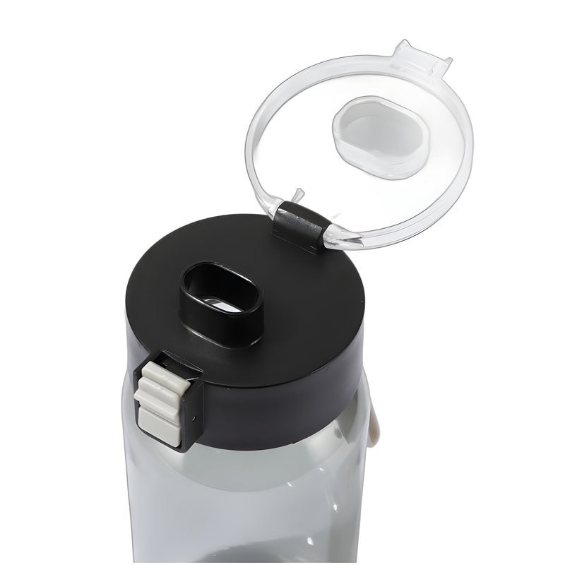 Estas fotos detalhadas mostram a tampa e a boca de uma garrafa de água. A tampa apresenta um design flip-top conveniente com um mecanismo de travamento seguro, garantindo desempenho à prova de vazamentos. Há também um prático laço de transporte para fácil portabilidade. A boca da garrafa tem um design liso e largo, facilitando o enchimento com água ou a adição de cubos de gelo, além de fácil de limpar.