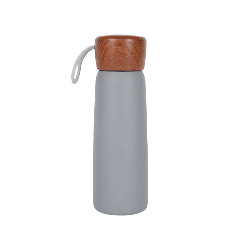 Quando uma garrafa minimalista encontra uma tampa de madeira, esta garrafa de água isolada em aço inoxidável com alça se transforma em sua 'companheira de bebida de qualidade' para a vida cotidiana.