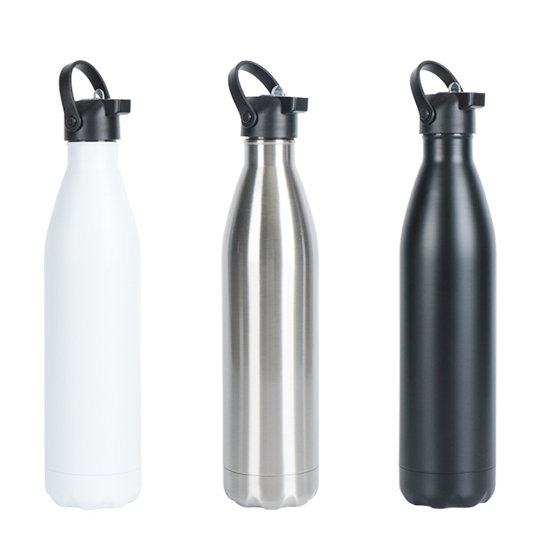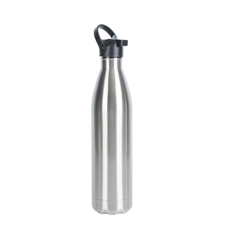 Esta é uma garrafa de água de aço inoxidável de 750 ml. Possui uma aparência elegante e metálica e uma alça preta na tampa para facilitar o transporte, adequado para várias ocasiões, como atividades ao ar livre ou uso diário.