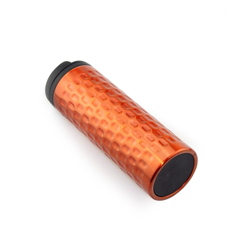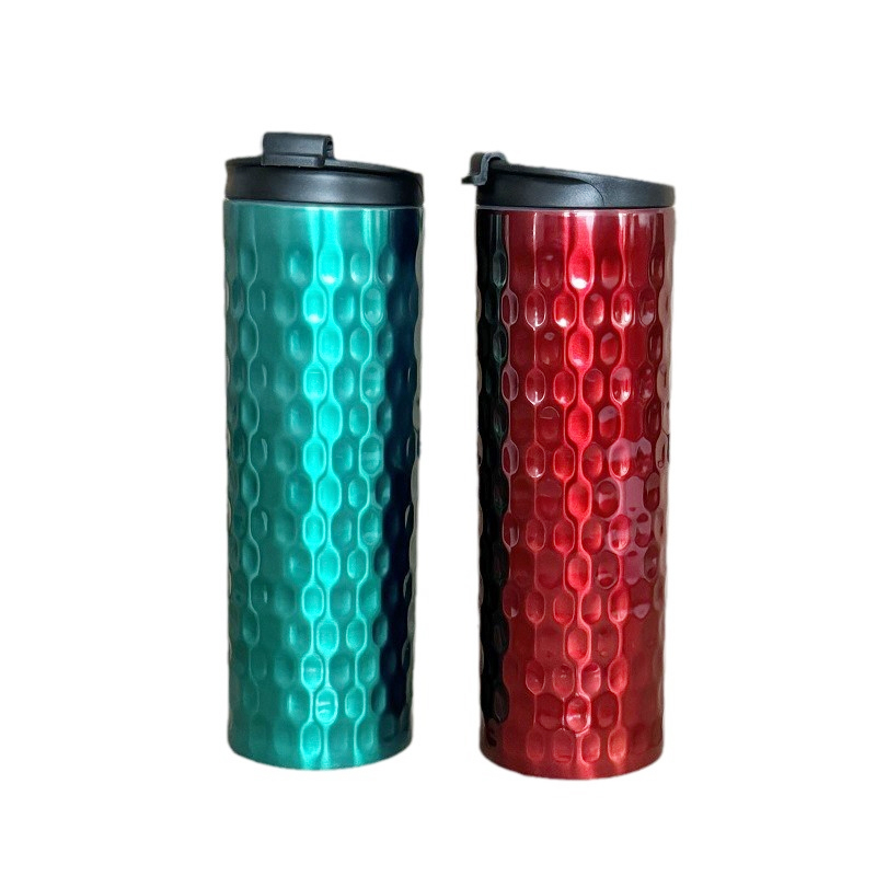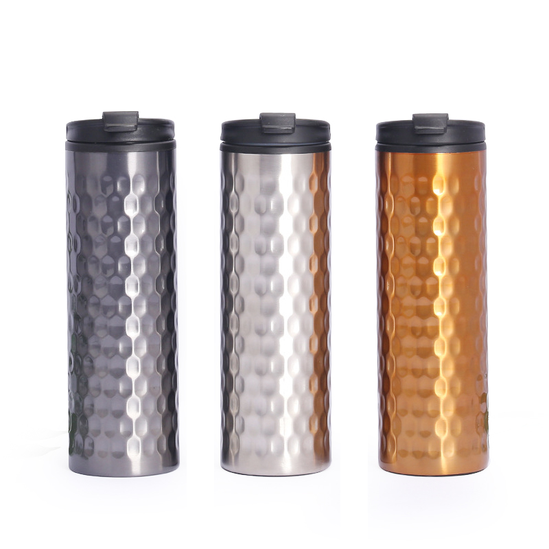 Este copo térmico possui um design distinto com várias opções de cores metálicas, incluindo cinza-prateado, prata e marrom dourado, mostrando texturas táteis ricas. O corpo possui um padrão em relevo parecido com padrões de favo de mel ou martelo, que não apenas adiciona profundidade visual e talento artístico, mas também aprimora o atrito da aderência para facilitar o manuseio. Emparelhado com uma tampa preta minimalista, o design alcança uma estética sofisticada e discreta que é prática para uso diário e elegante o suficiente para se destacar como um companheiro de viagem chique.