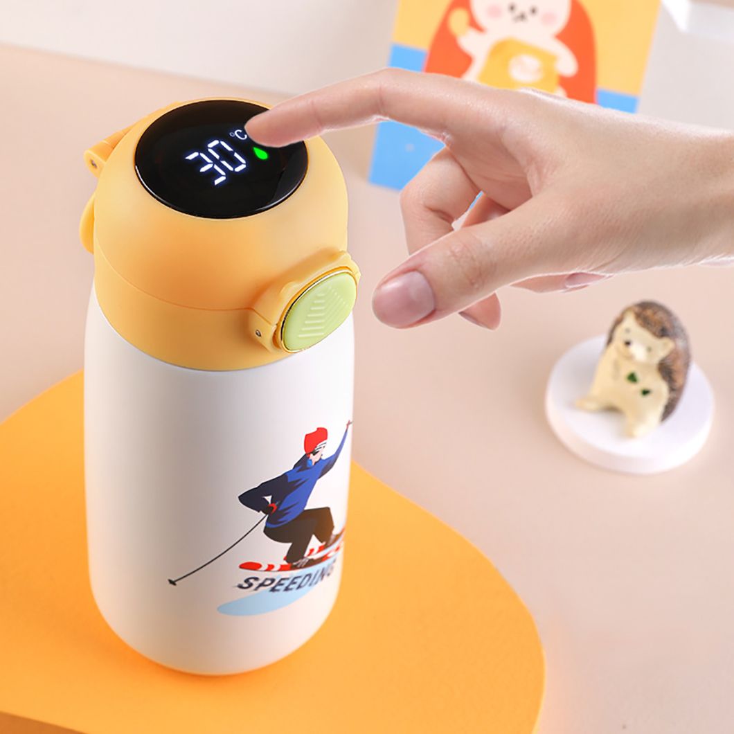 O ThermoM Cup dessas crianças se livra do problema de testar a temperatura da água. Com apenas um toque suave, ele pode exibir a temperatura. A tampa é amarela e há uma tela digital no topo que mostra claramente a temperatura. É muito conveniente para as crianças saber se a água é adequada para beber, garantindo que possam desfrutar de sua bebida com segurança e conforto.
