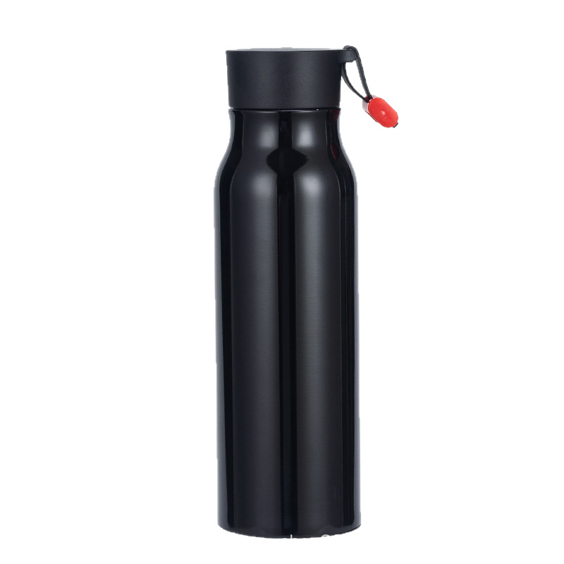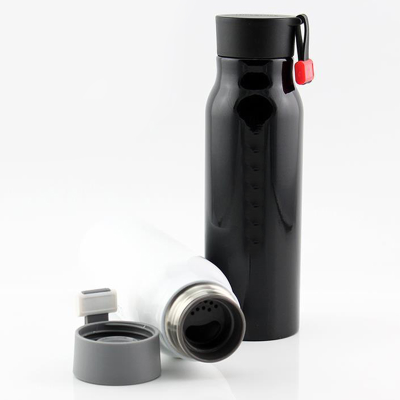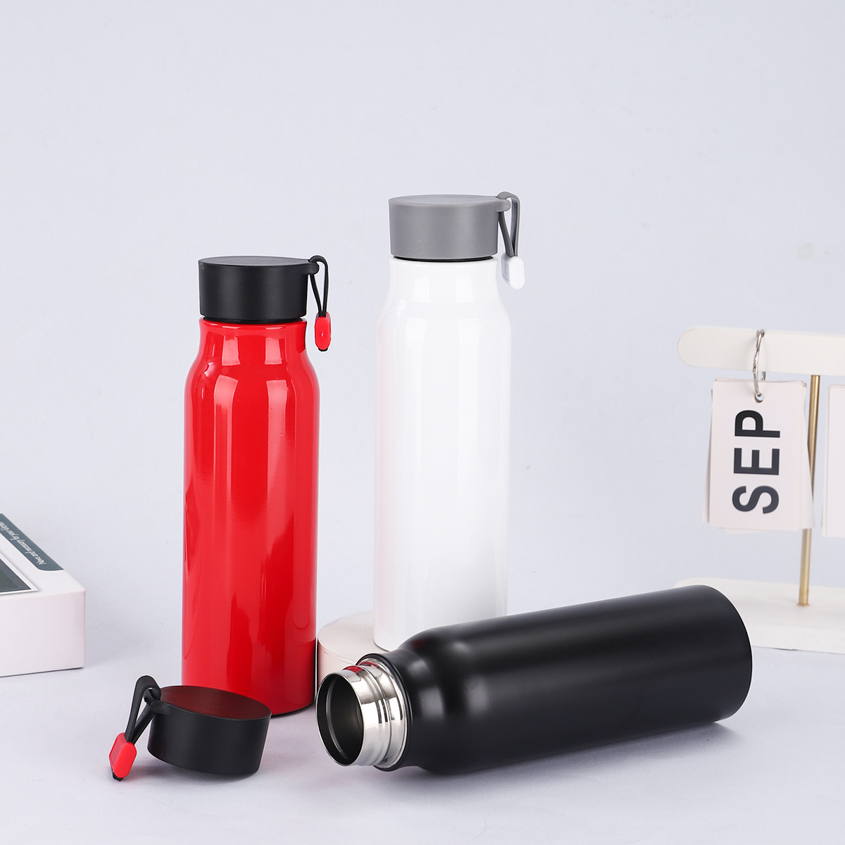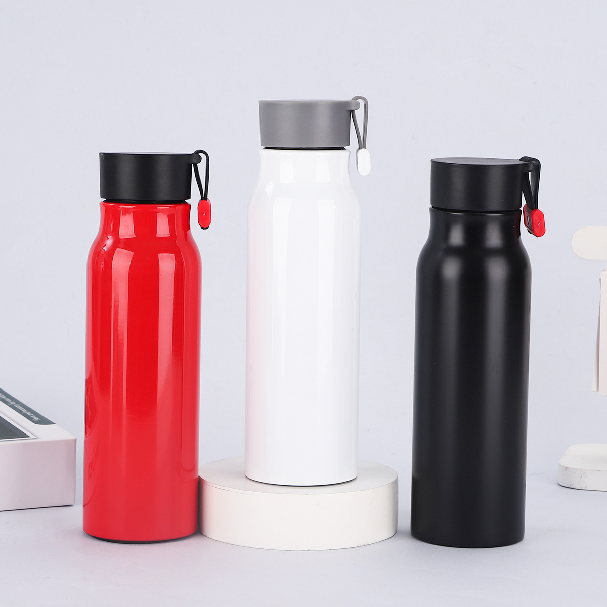 A imagem mostra uma variedade de garrafas de água isoladas. Eles vêm em cores diferentes, como roxo claro, vermelho, azul claro, branco, verde claro, preto e rosa. Cada garrafa tem uma tampa, alguns com ganchos ou loops anexados para facilitar o transporte. Essas garrafas provavelmente têm um bom desempenho de calor - preservação, adequado para manter as bebidas quentes ou frias, e são convenientes para uso diário, seja no trabalho, na escola ou durante as atividades ao ar livre.